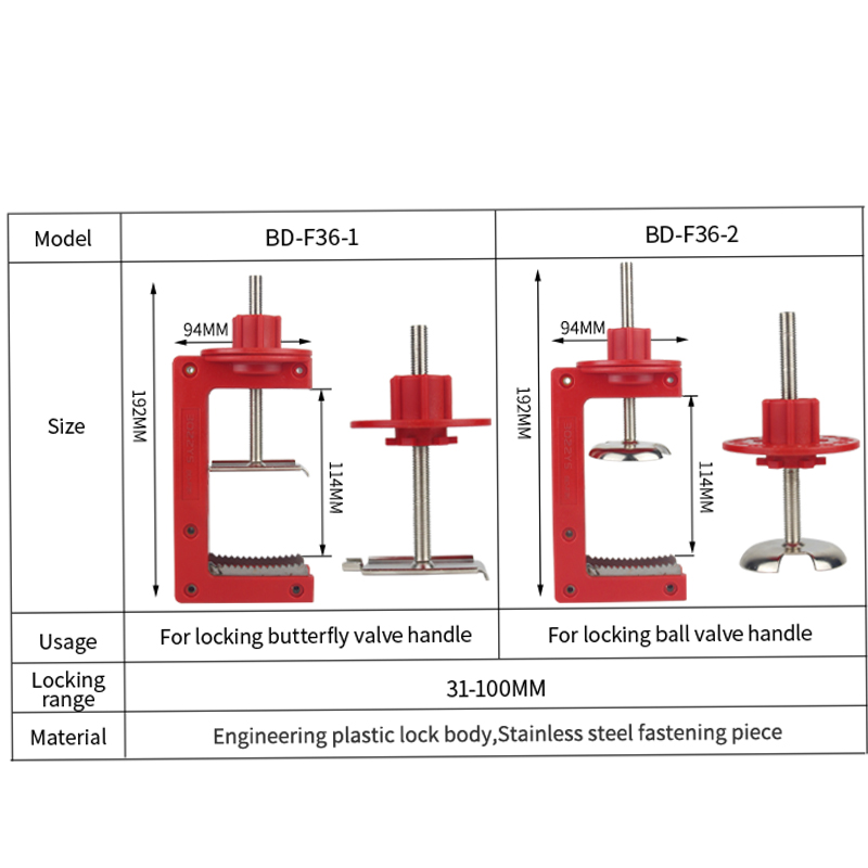 可調(diào)節(jié)蝶閥鎖BD-F36-1適用于閥門鎖定范圍:31MM-100MM;支持多把掛鎖同時對設備進行上鎖掛牌,有效管理,防止閥門意外啟動。