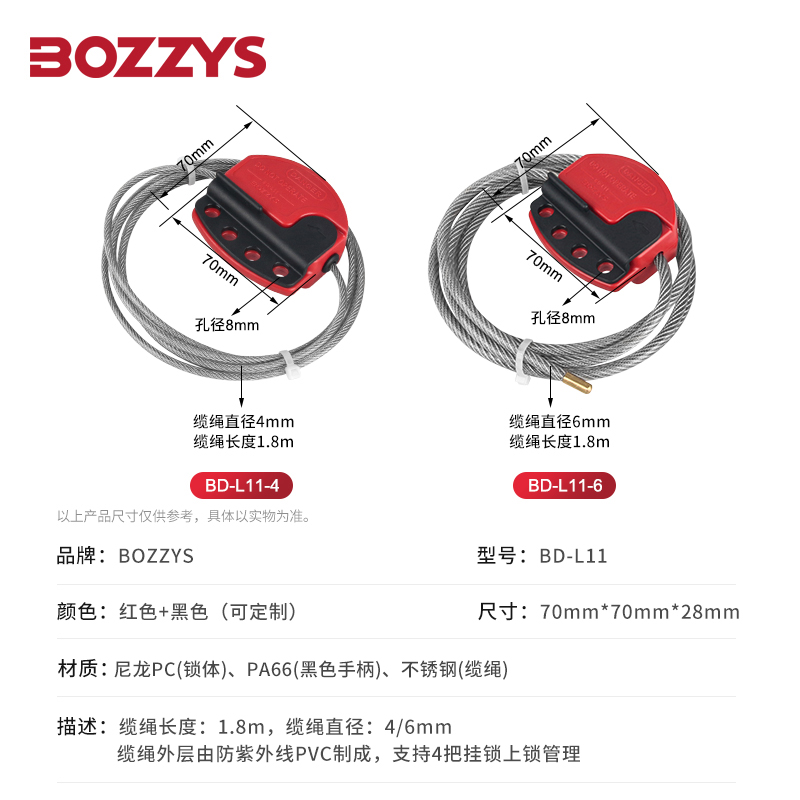 不銹鋼可調(diào)節(jié)纜繩鎖BD-L11-4帶有纜繩長度1.8m,纜繩直徑4mm,用于工業(yè)設(shè)備上鎖掛牌,建議與安全掛鎖和安全標識牌配套使用,以達到設(shè)備鎖定、能量隔離、防止誤操作的目的。