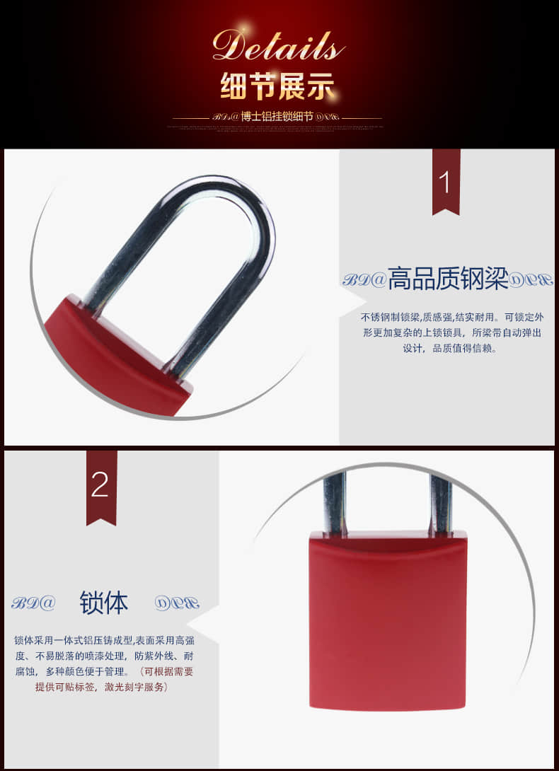| BD-A03 | 鋁鎖(藍(lán)) | 例:鋼制鎖梁紅 色掛鎖型號(hào)為BD-A01 不銹鋼鎖梁型號(hào)后面 帶“S”,例BD-A01S | ||