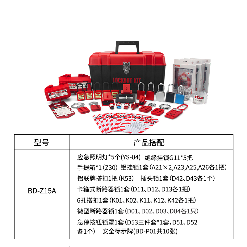 BOZZYS 便攜式安全鎖具套裝 BD-Z15A 配有安全掛鎖、搭扣、標(biāo)簽以及各種斷路器鎖、急停按鈕鎖等電氣鎖,包括進(jìn)行鎖定所需的鎖具。安全鎖具可以放在鎖具箱中,以幫助將設(shè)備和掛鎖保持在一起。為了增加個(gè)人工人的便利,掛鎖提供了相應(yīng)的鑰匙。