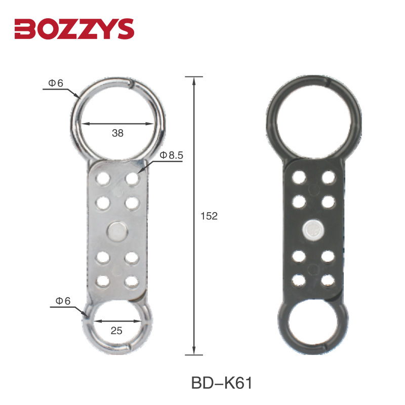 BOZZYS 雙頭鋁制搭扣鎖 BD-K61 采用防火花,抗沖擊、耐腐蝕的鋁合金材質制成,帶有 1 ''(25 mm)和1.5''(38mm)鉗口直徑,可容納8個掛鎖。非常適合在每個鎖定點由多名工人鎖定,搭扣可在進行維修或調整時保持設備不工作。在從搭扣上取下最后一個工人的掛鎖之前,無法打開控制。