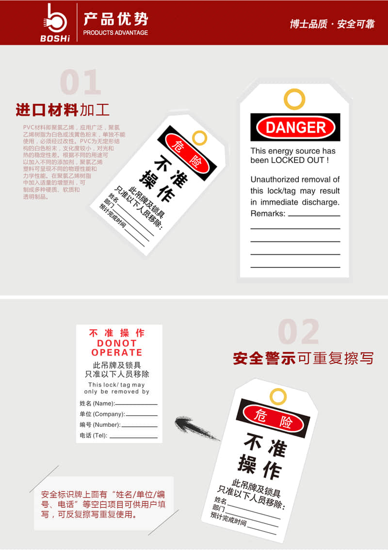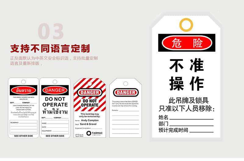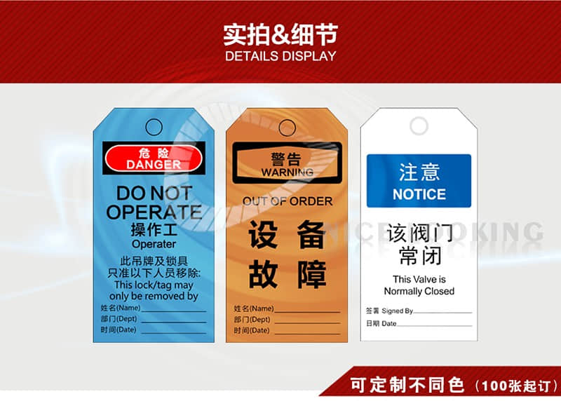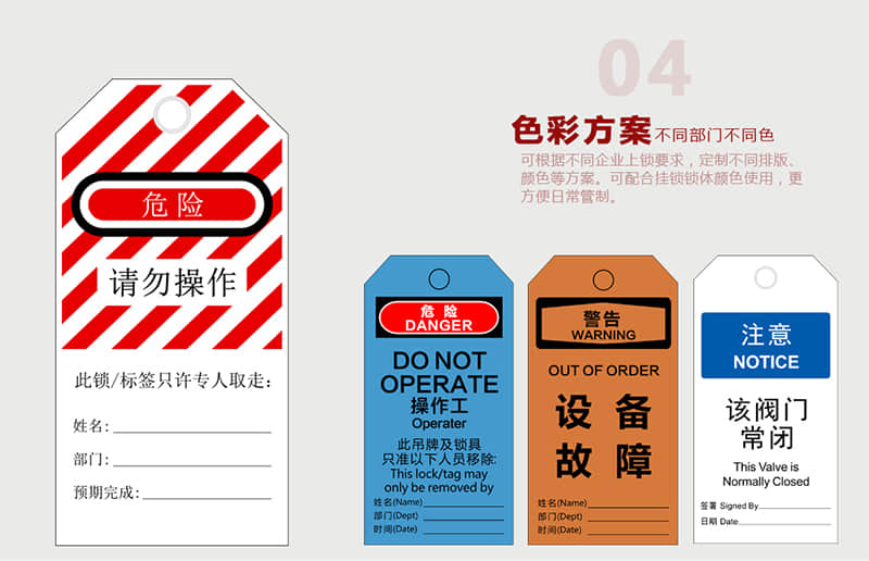 b.安全吊牌上有“危險(xiǎn)/禁止操作/注意等 ”安全警示語和“姓名/部門/預(yù)計(jì)完成時(shí)間等”空白項(xiàng)目供用戶填寫